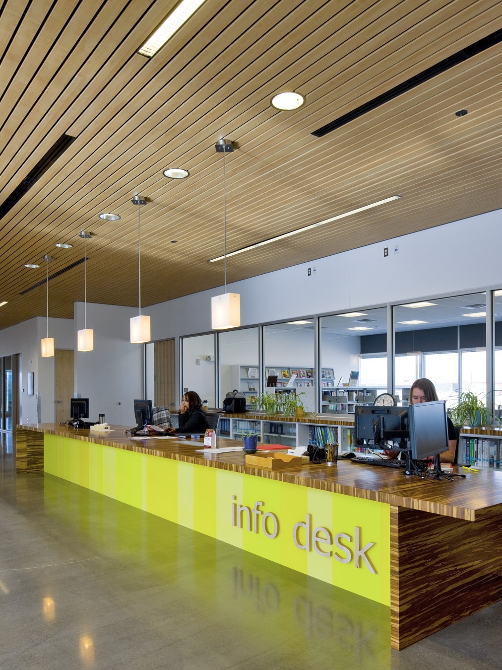 Several vital moments along the Loop, such as the central information desk, café, and art display cases, are distinguished through the combination of acrylic "CNM yellow" panels and Cali Bamboo Marbleized Fossilized Plywood, a rapidly renewable resource.