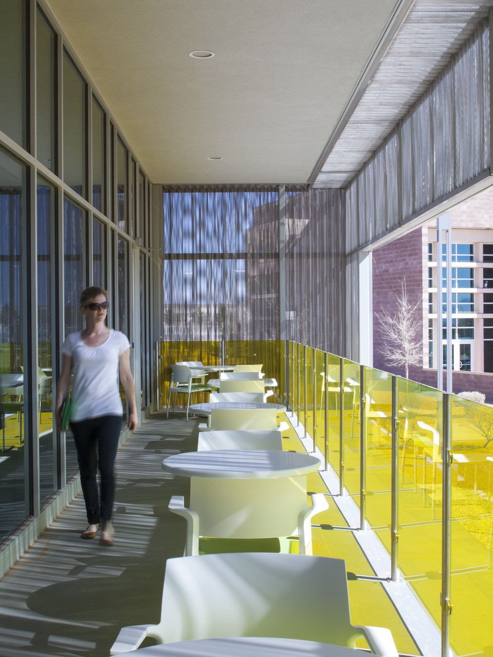 Faculty Pods distributed along the Learning Commons Loop and near class and study rooms encourage students and faculty to cross paths daily in an impromptu way. The building meets the 2030 Challenge for energy performance with an intensive daylighting strategy, self-shading envelope, and the installation of geothermal wells and solar panels.