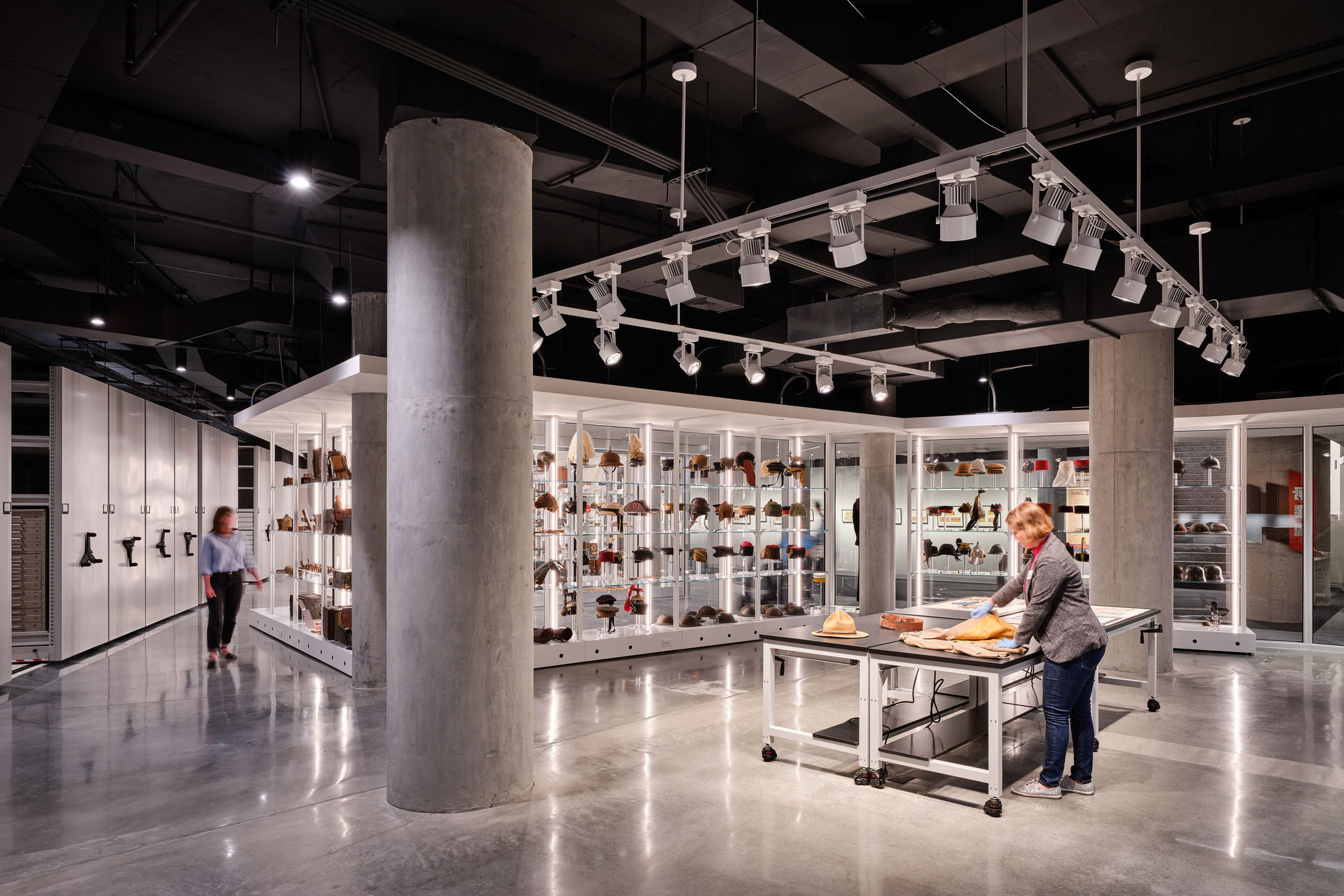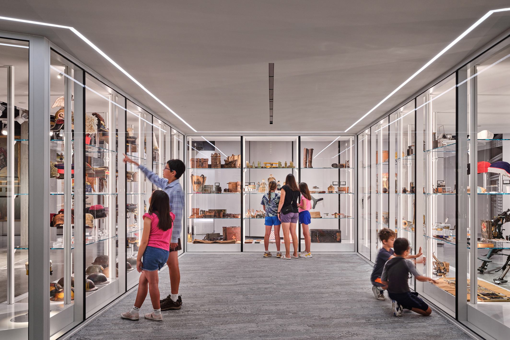 In another stride toward modernization and improved public engagement, Multistudio undertook the renovation and adaptive reuse of the Bergman Family Gallery and Open Storage Center, which opened in 2023. By repurposing an underused storage corridor and research room, this endeavor added approximately 4,000 SF of exhibition space by making artifacts that were previously hidden from view accessible to the public through an expansive 190-foot “coastline” of window cases. The new space fosters a sense of transparency and showcases the dedicated efforts of the museum’s staff by providing clear site lines to an open storage center and work room.