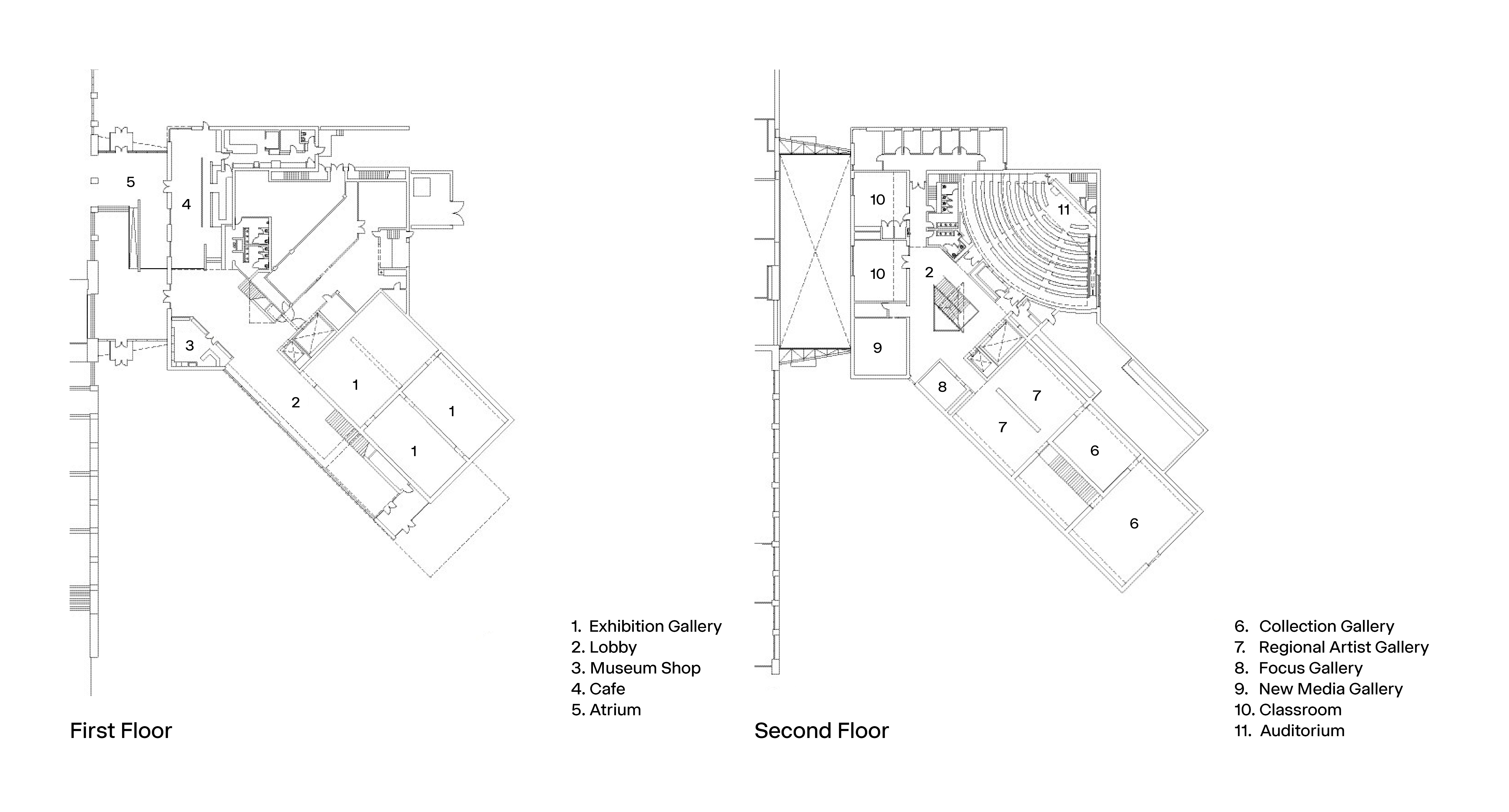 The museum features 11,000 SF of gallery space for temporary shows, permanent exhibitions, and special events with local and national artists. Rift sawn white oak floors give the galleries warmth and scale, and limestone floors define the public spaces and the stairs. Natural light from clerestory windows bathe walls in natural light, enhancing the viewing experience while blurring the boundary between indoor and outdoor environments.
