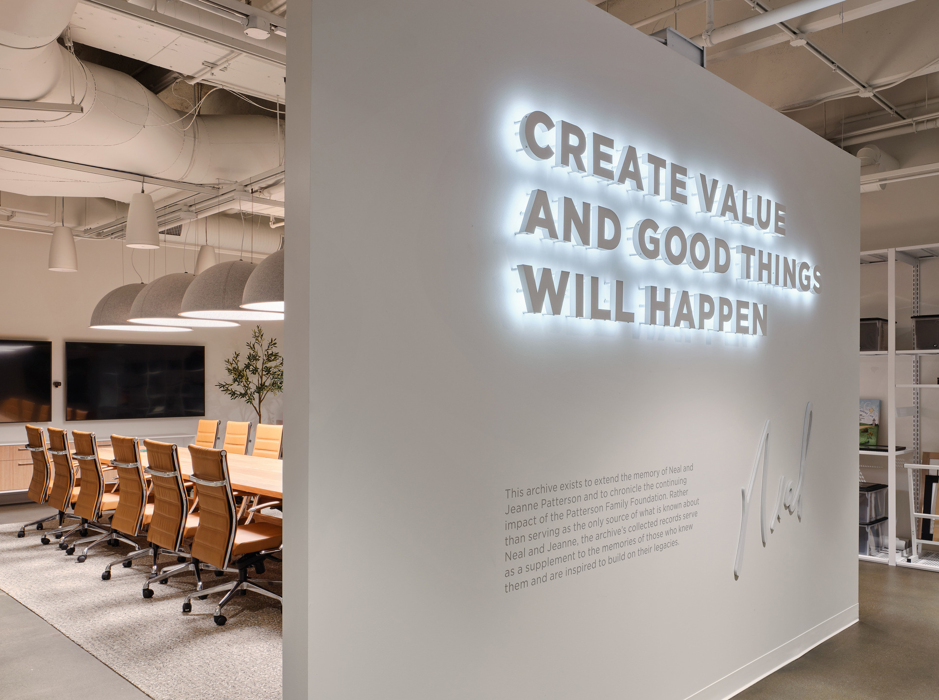 The Patterson Family Foundation and Pandi Capital, the philanthropic and investment arms of the Patterson family, approached us with an uncommon challenge: to create a single headquarters that serves two distinct organizations while expressing a single, deeply personal legacy. Unlike other clients with established visual systems, this project began with no brand palette, and the visual and spatial language had to be developed from the ground up.