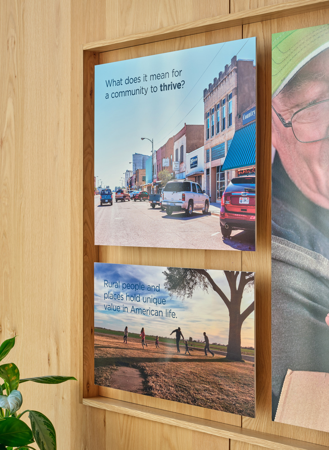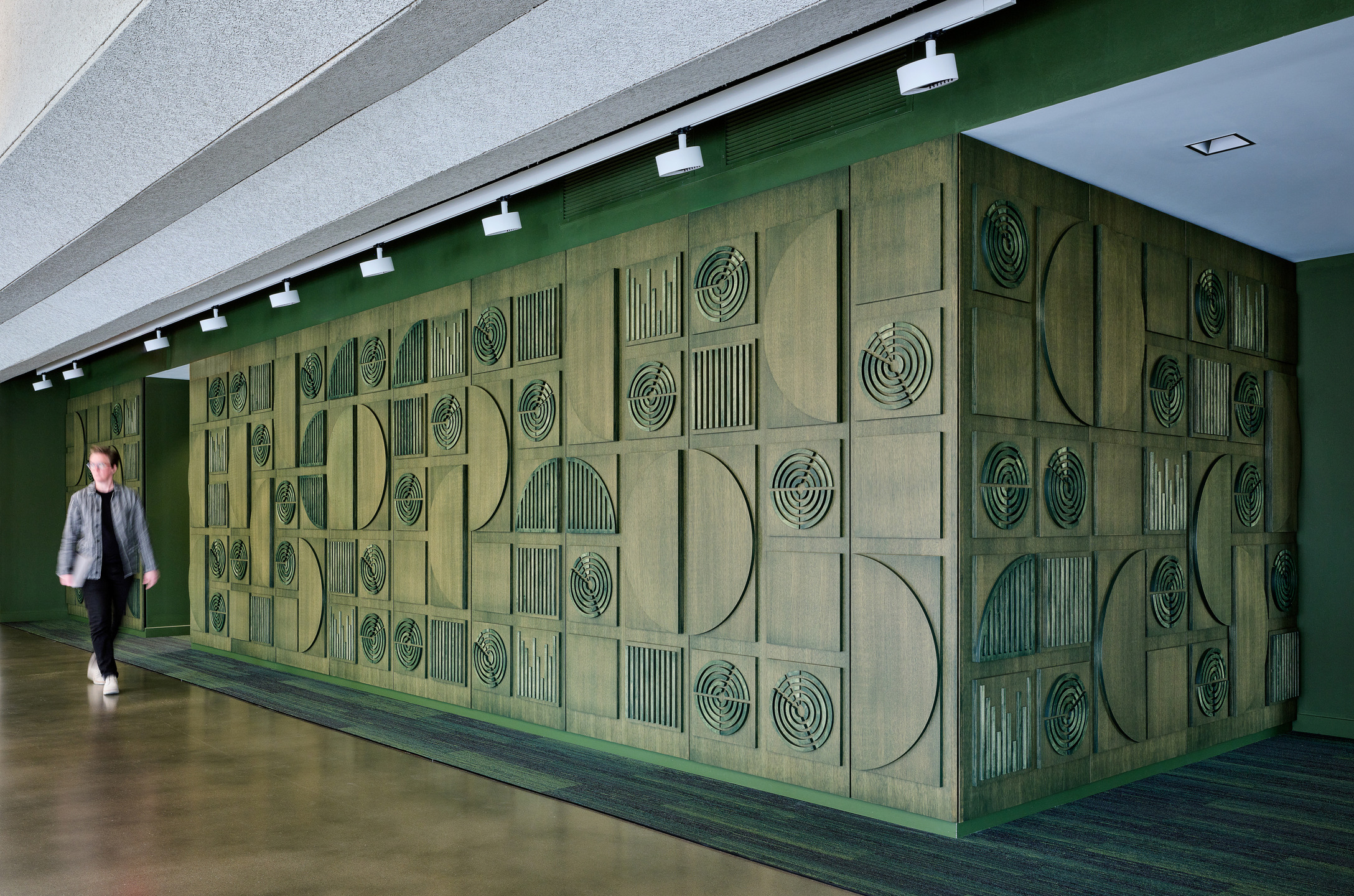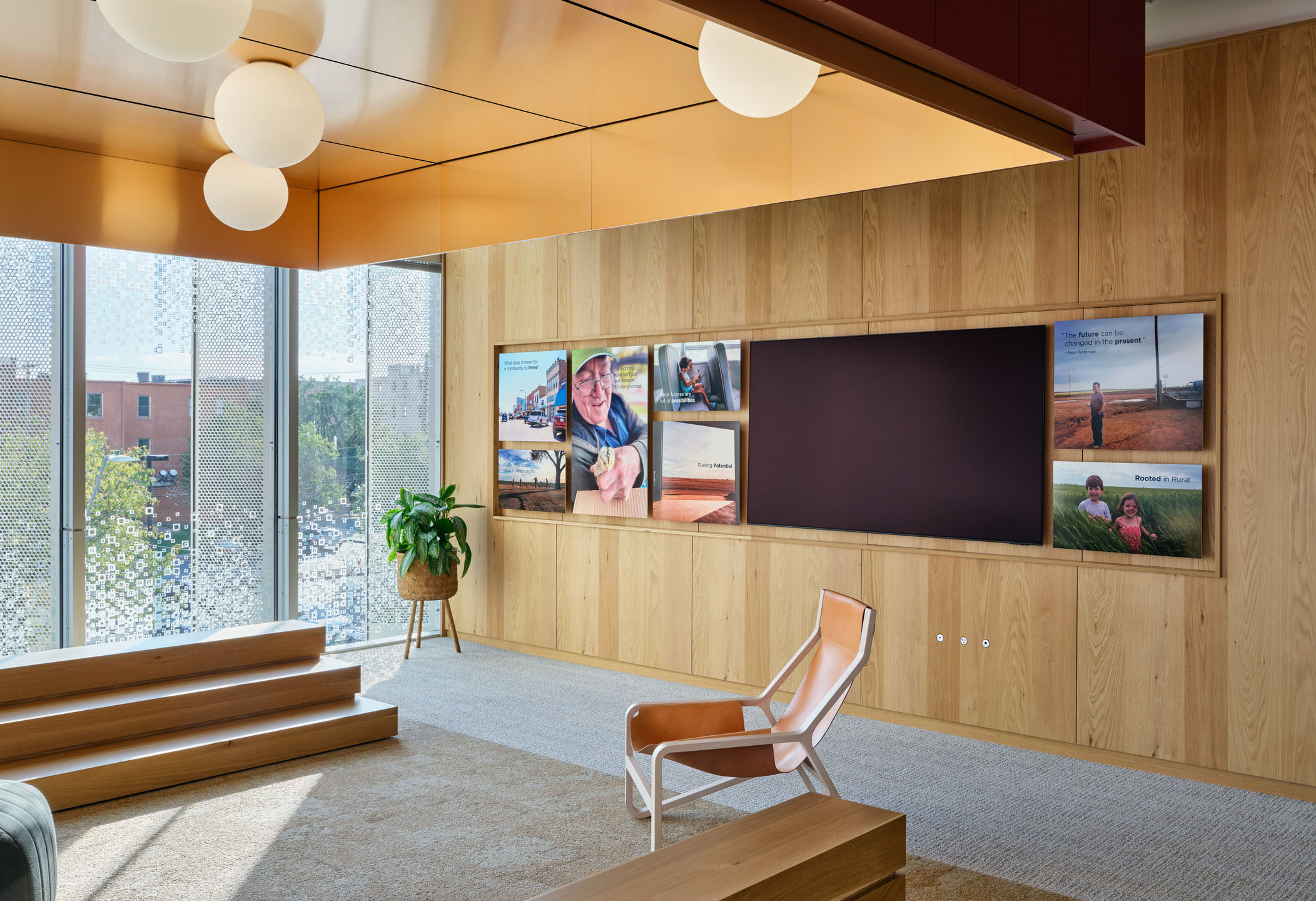 From one angle, the Growth Wall depicts aerial farmland, a nod to the foundation’s rural focus and Neil Patterson’s agrarian upbringing. From another perspective, the wall illustrates data visualization, signifying bar charts and circular forms that speak to the analytical rigor of investment work.