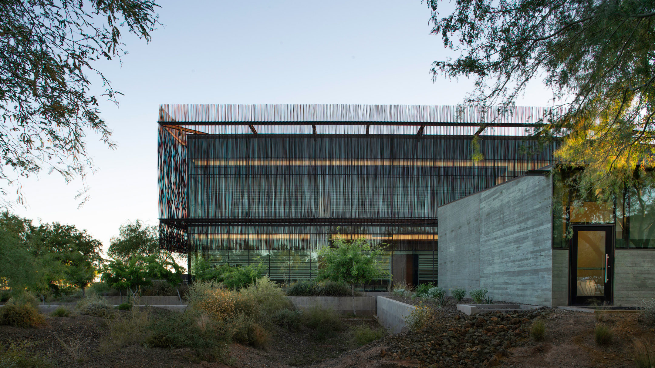 The organization of the Justice Center is orchestrated around exterior space. The building is conceived as a backdrop to a variety of outdoor rooms and "desert scapes" to represent tribal intimacy with native lands. The primary materials–glass, weathered steel and concrete–retain the vernacular of austere objects that are often all that remain after prolonged exposure in the desert.