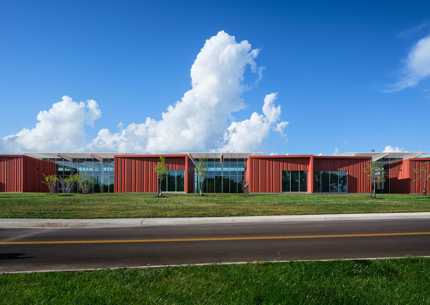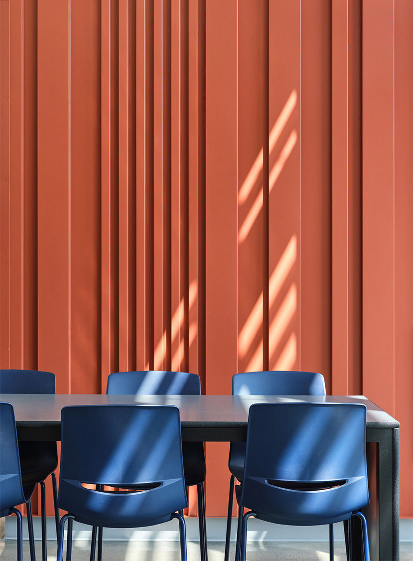 The rhythm of a delicate louver and texture of a custom corrugated skin playfully express the natural dynamics afforded by the sun, creating an organic sense of place within the surrounding landscape.
