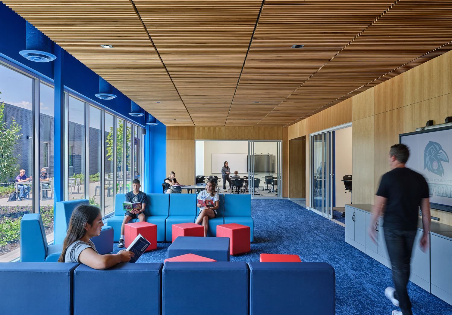 At the heart of the design is the “Forest Walk,” a circulation spine adjacent to the site’s wooded edge that unites dining, library, and commons into a vibrant, all-day learning hub. This strategic consolidation of underutilized programs reduced the school’s footprint by nearly 10,000 SF without sacrificing function—freeing resources for enhanced programming. Informed by student feedback through surveys and workshops, the design directly reflects the needs and aspirations of its learners.