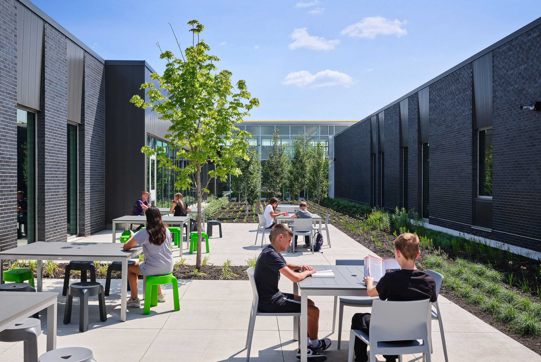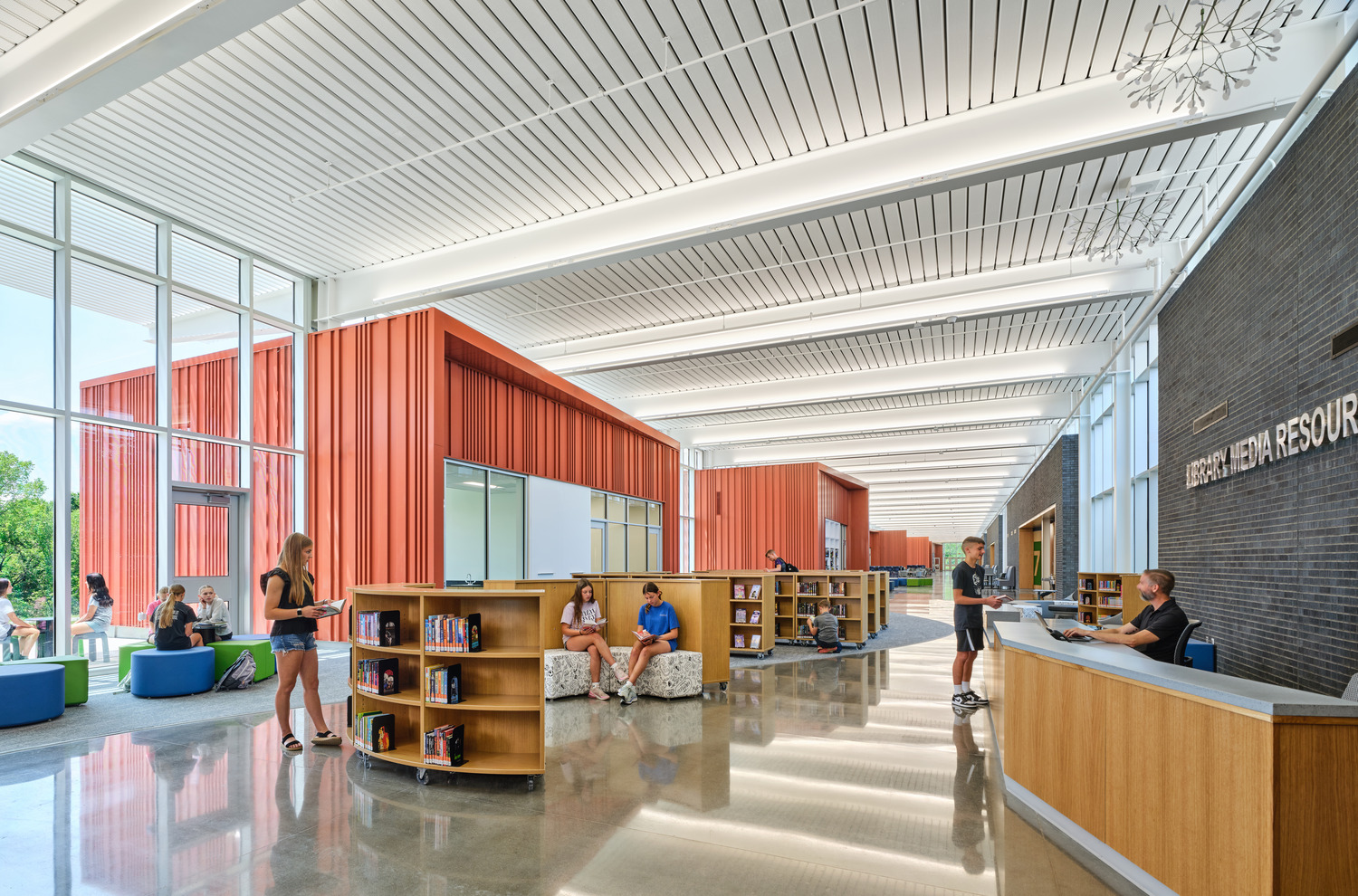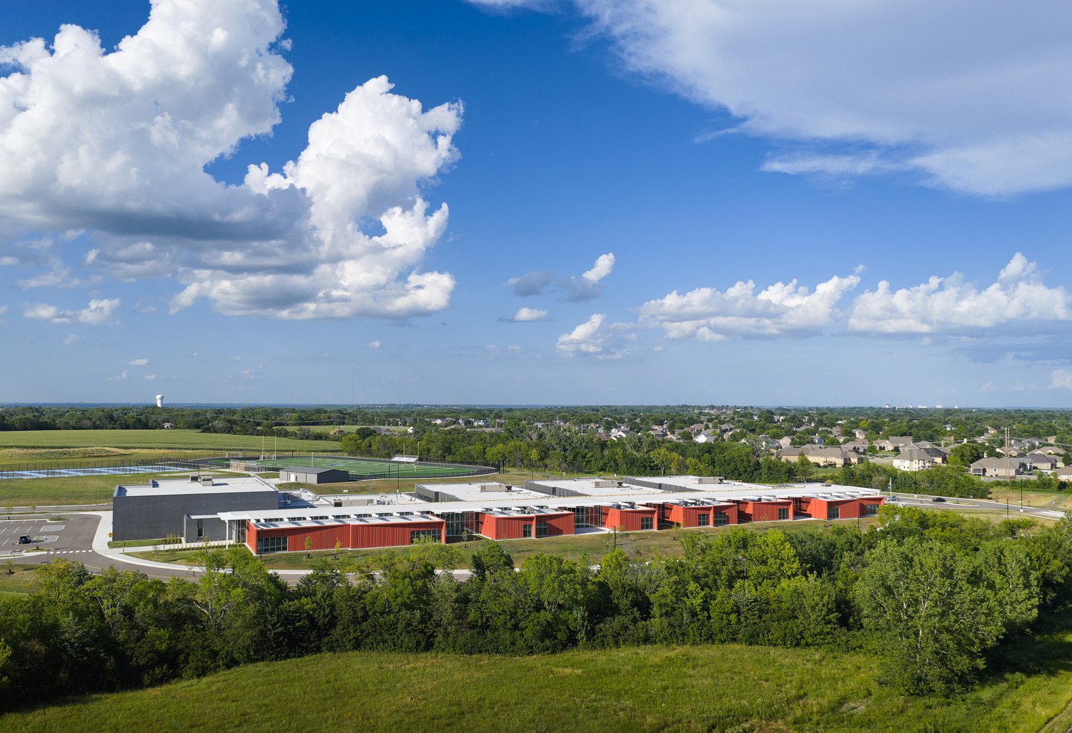 Inspired by the color, rhythm, and scale of the rural Kansas landscape, Washburn Rural North Middle School bridged learning spaces to the natural environment, celebrating the dynamic experiences afforded by daylight, vegetation, seasons, and sky.